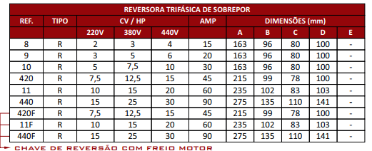 OBS: NO CASO DA INSTALAÇÃO DA CHAVE DE REVERSÃO COM FREIO MOTOR DEVE-SE UTILIZAR UMA PONTE RETIFICADORA PARA A LIGAÇÃO DA MESMA.