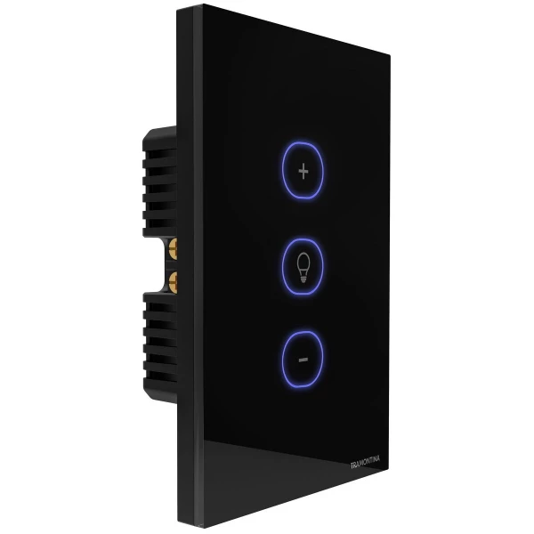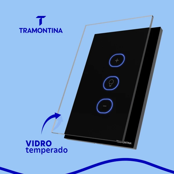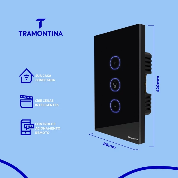 O dimmer onne smart Tramontina Preto é a escolha perfeita para quem busca uma iluminação personalizada e conectada. Com ele, é possível criar cenas para cada momento do seu dia, seja para relaxar após um longo dia de trabalho, para assistir a um filme ou para receber visitas. E o melhor: tudo isso pode ser controlado com o toque suave do botão, por comando de voz através dos assistentes Google e Alexa, ou pelo seu celular de onde estiver. Além disso, ele é muito mais que um simples dimmer: pois conta com tecnologia IoT, que permite programar as luzes de acordo com a previsão do tempo e localização, ajudando a economizar energia e a facilitar a sua rotina. Tudo isso com um design sofisticado, com painel em vidro na cor preta e botão Touch retro iluminado com LEDs azuis. É importante lembrar que ele é bivolt e precisa de fio neutro para instalação. Ele também deve ser utilizado com lâmpadas dimerizáveis, sejam elas LED, halógenas ou incandescentes, e precisa de rede Wi-Fi de 2.4 giga hertz para funcionar. Conta ainda com Bluetooh para auxiliar na configuração no aplicativo e aceita comunicação por rádio frequência 433 mega hertz, que garante conexões por controles remotos. Deixe sua casa conectada, inteligente e com uma iluminação personalizada, com os itens da linha Smart Tramontina!